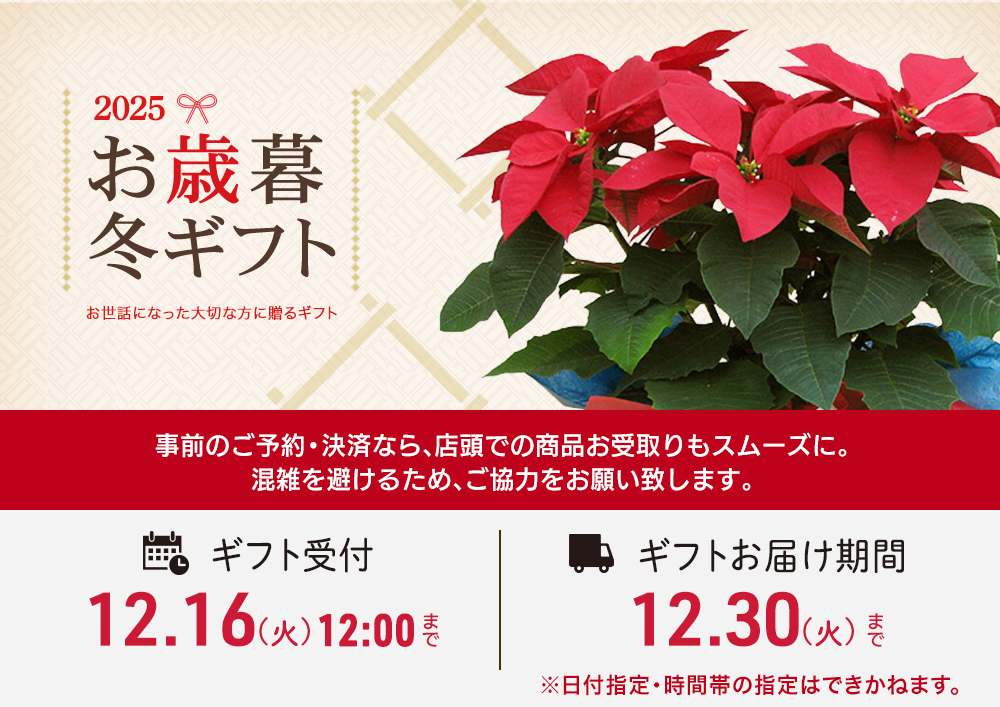 TOP 季節のギフト お歳暮・冬のギフト 一年の感謝を込めて、お世話になった方へお歳暮・冬ギフトにフラワーギフトをお届け。 富山の花屋「花メイト」では定番のシクラメンからちょっと豪華な「シンビジウム」まで、各種フラワーギフトを取り揃えております。 県外へお届けの場合、生花の商品(花束・アレンジメント)はすべて、鮮度を保つため、お近くのフラワーネット加盟店からの配達となります。商品内容が多少変更される場合もございますのでご了承ください。 表示切替: 写真のみ 説明付き 5件中1件~5件を表示 商品一覧 WP-001 シクラメン(フリンジ咲き) ¥5,500(税込) WP-004 ポインセチア(赤) ¥3,300(税込) WP-005 シンビジウム(オレンジ)3本立ち ¥11,000(税込) WP-006 シンビジウム(ピンク)3本立ち ¥11,000(税込) WP-007 シンビジウム(アーチタイプ) ¥19,800(税込) 5件中1件~5件を表示