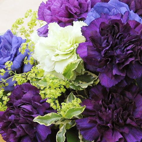 青いカーネーション、その名は「ムーンダスト」、花言葉は「永遠の幸福」で、「月の光のようにやわらかな包容力のある花に」との思いをこめて名づけられたお花のアレンジフラワー。