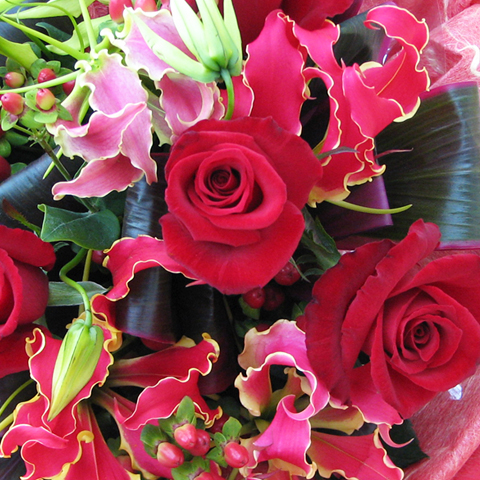 | 花材 | 赤バラ、グロリオサリリー、ヒペリカム、赤ドラセナなど(生花のため商品の色、内容が写真と若干異なる場合があります。) |