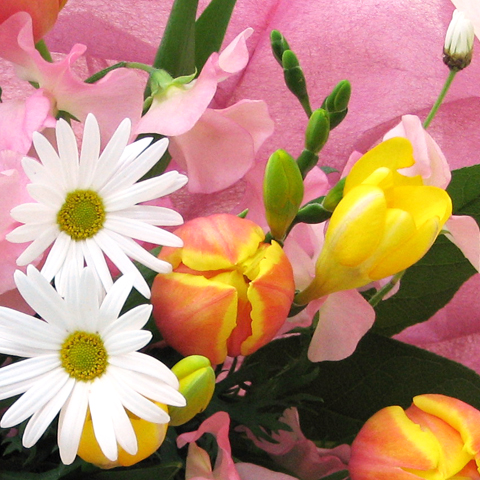 | 花材 | チューリップ、スィートピー、フリージア、マーガレットなど(生花のため商品の色、内容が写真と若干異なる場合があります。) |