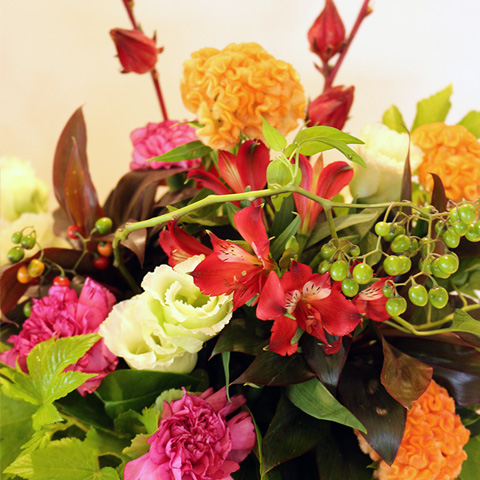 | 花材 | ベニアオイ・ケイトウ・ベビーハンズ・アルストロメリア・カーネーション・トルコキキョウなど(季節ごとに多少花材が変わることがあります。ご了承ください。) |